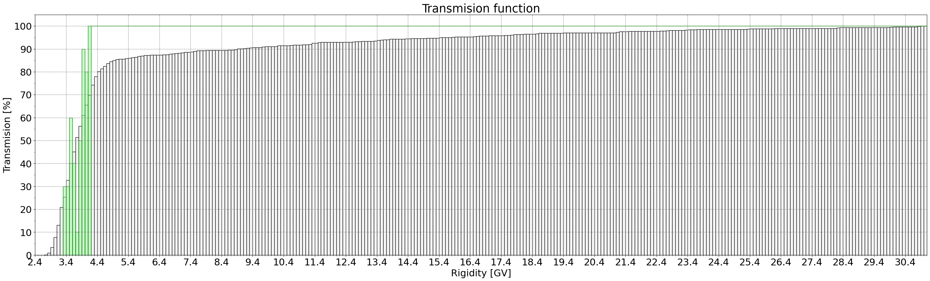 Transmission function, denoted by black line, shows probability of particles from all directions with rigidity R to reach selected point inside magnetosphere. Green histogram displays transmission function for vertical incoming trajectories.